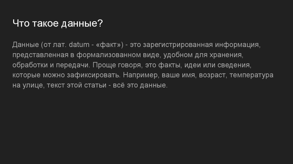 Что такое данные?Данные (от лат. datum - «факт») - это зарегистрированная информация,