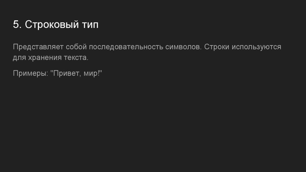 5. Строковый типПредставляет собой последовательность символов. Строки используются