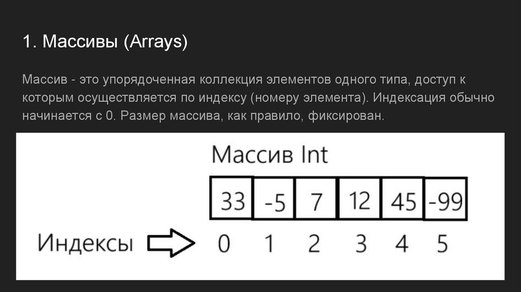 1. Массивы (Arrays)Массив - это упорядоченная коллекция элементов одного типа, доступ к