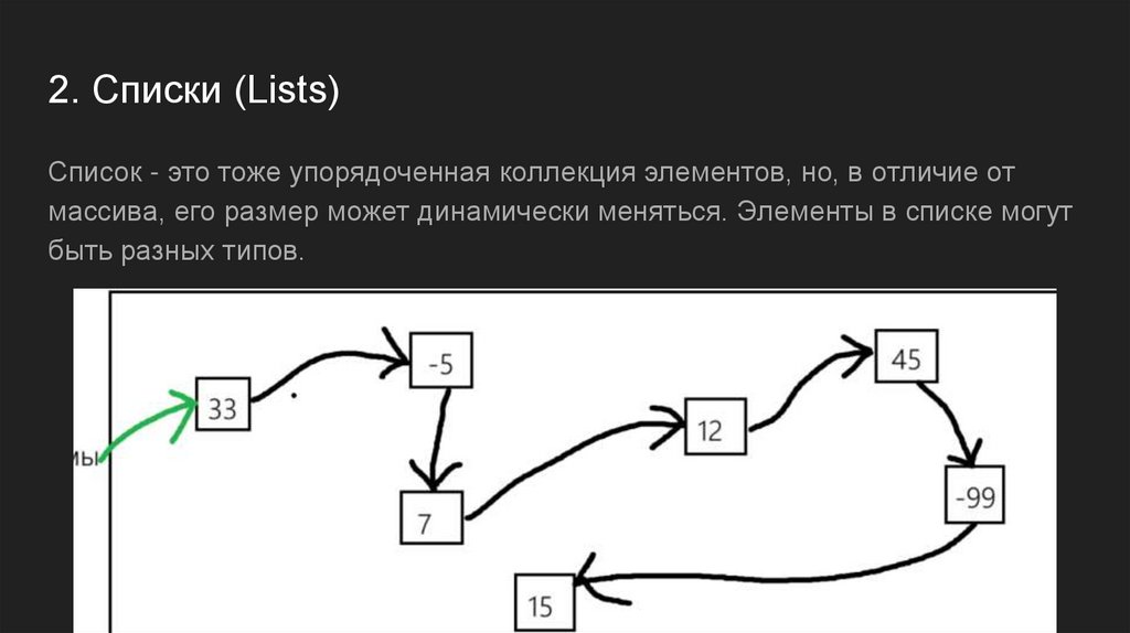 2. Списки (Lists)Список - это тоже упорядоченная коллекция элементов, но, в отличие от