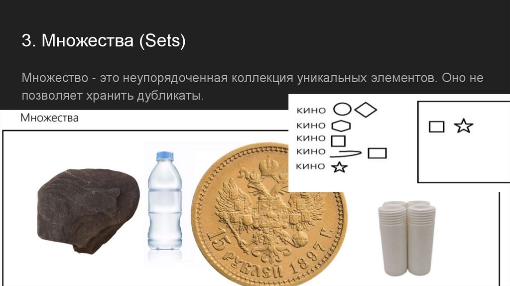 3. Множества (Sets)Множество - это неупорядоченная коллекция уникальных элементов. Оно не