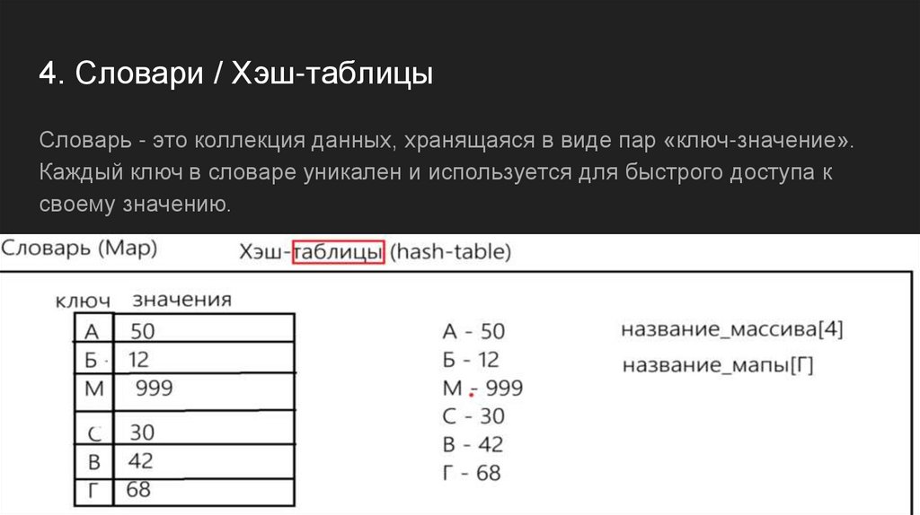4. Словари / Хэш-таблицыСловарь - это коллекция данных, хранящаяся в виде пар «ключ-значение».