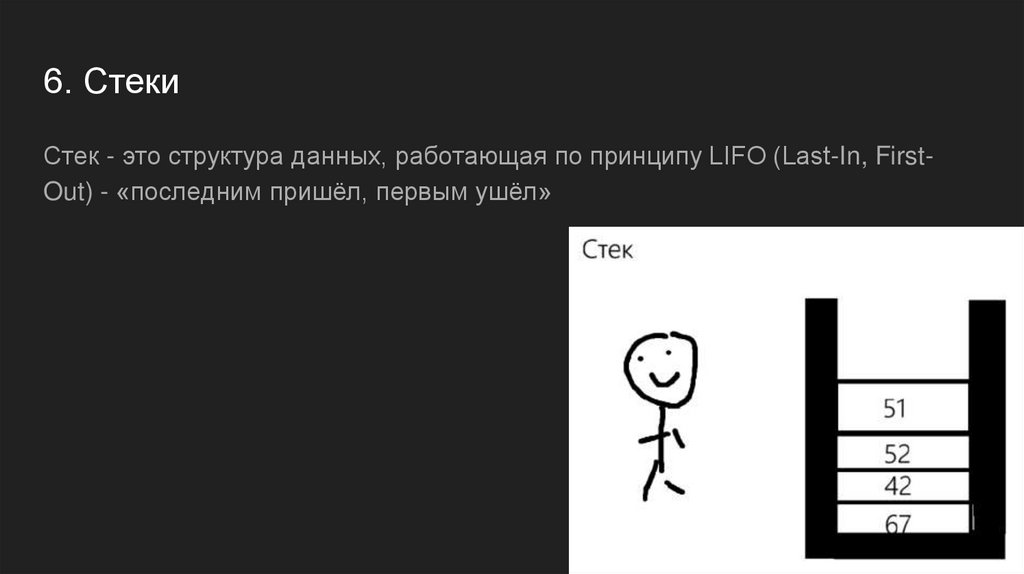 6. СтекиСтек - это структура данных, работающая по принципу LIFO (Last-In, FirstOut) - «последним пришёл, первым ушёл»