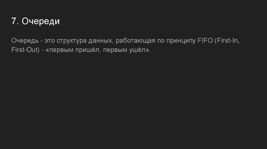 7. ОчередиОчередь - это структура данных, работающая по принципу FIFO (First-In,