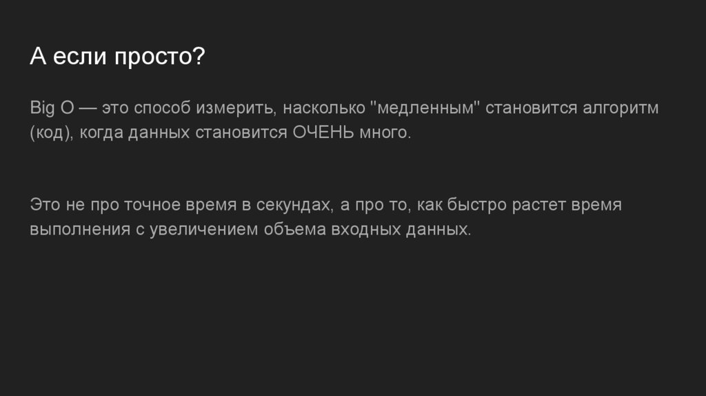 А если просто?Big O — это способ измерить, насколько "медленным" становится алгоритм