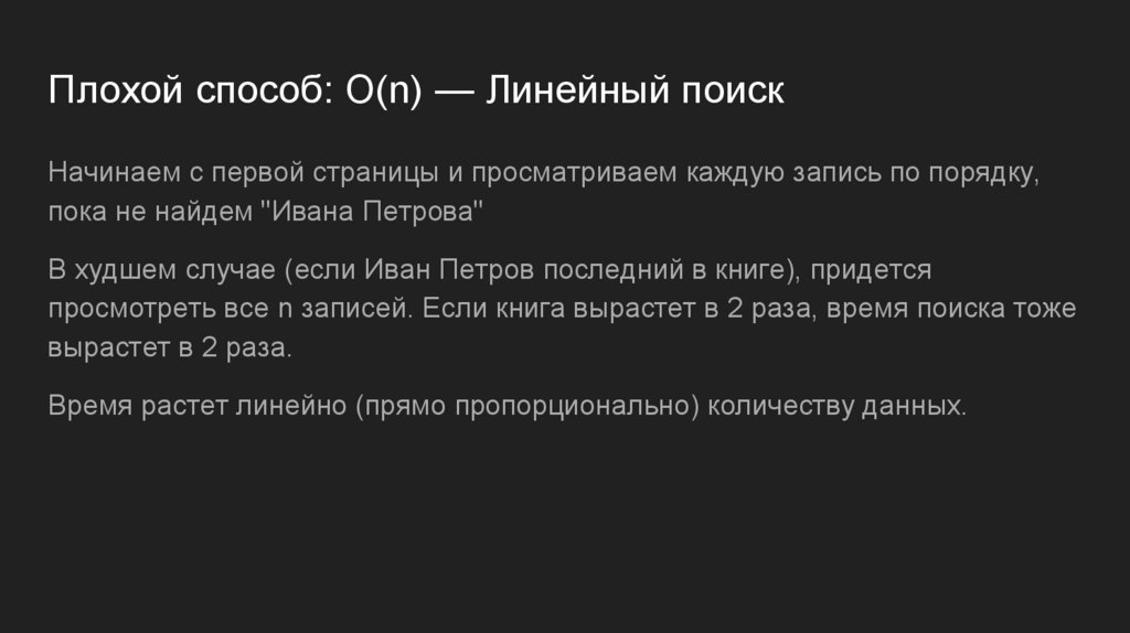 просмотреть все n записей. Если книга вырастет в 2 раза, время поиска тоже