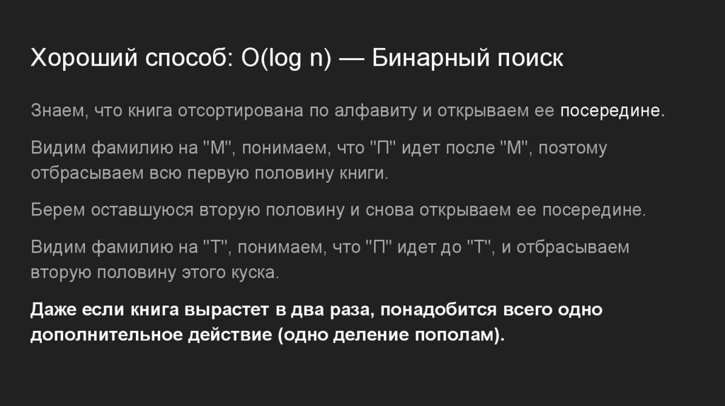 Хороший способ: O(log n) — Бинарный поискЗнаем, что книга отсортирована по алфавиту и открываем ее посередине.