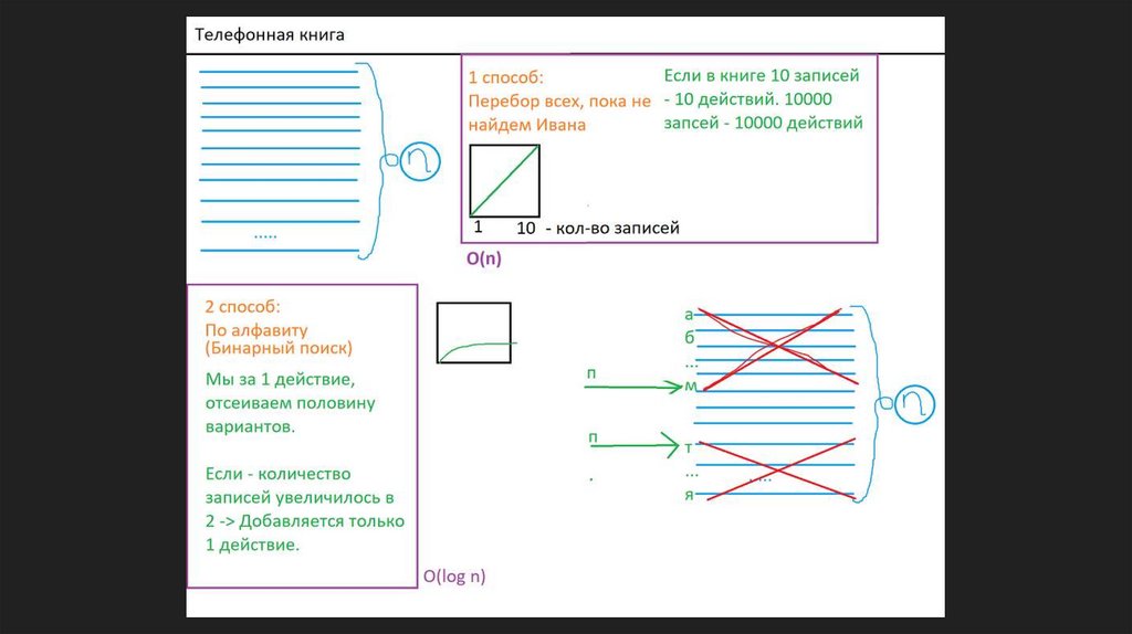 Если в книге 1 000 000 записей, O(n) в худшемслучае потребует 1 000 000 шагов, а O(log n) —