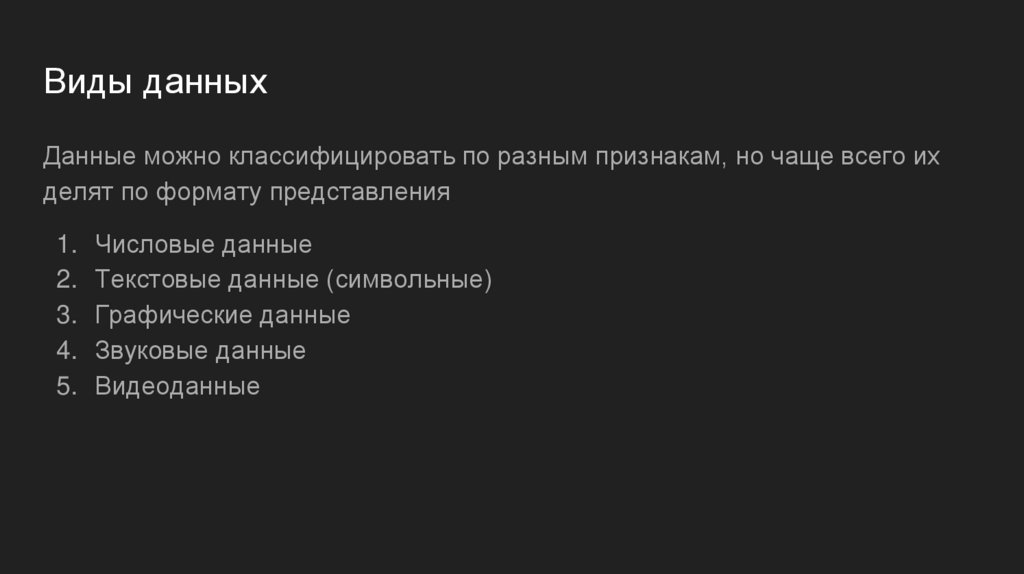 Виды данныхДанные можно классифицировать по разным признакам, но чаще всего их
