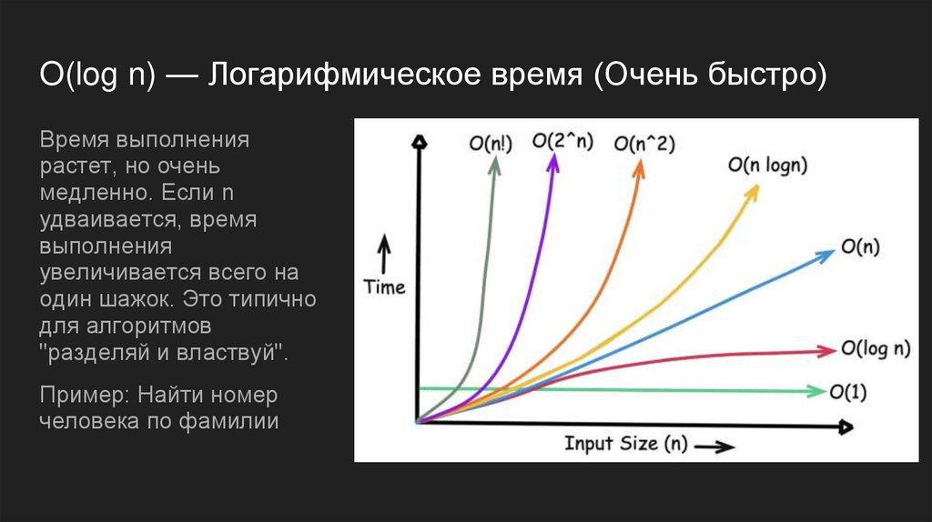 O(log n) — Логарифмическое время (Очень быстро)Время выполнения