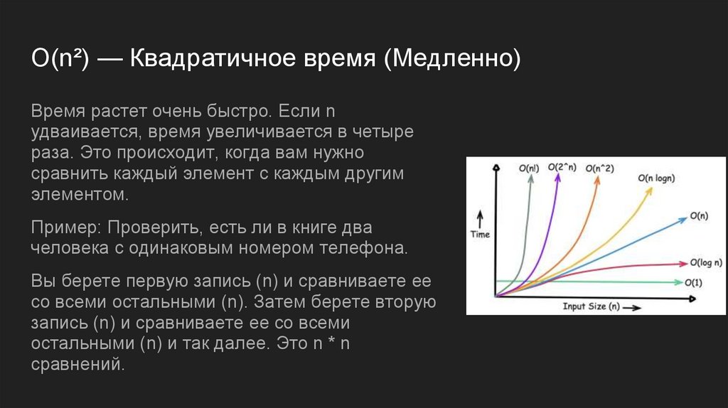 O(n²) — Квадратичное время (Медленно)Время растет очень быстро. Если n