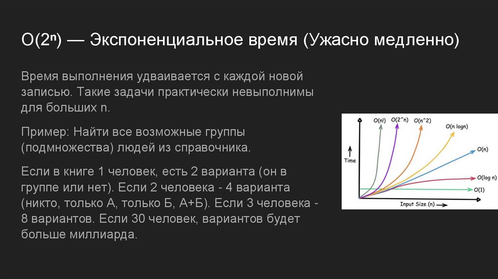 O(2ⁿ) — Экспоненциальное время (Ужасно медленно)Время выполнения удваивается с каждой новой