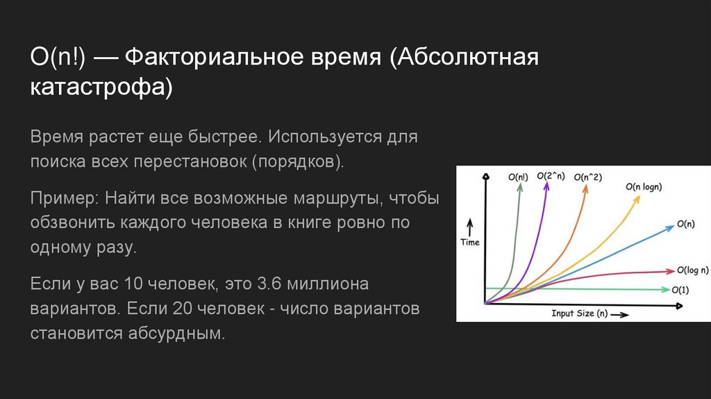 O(n!) — Факториальное время (Абсолютнаякатастрофа)