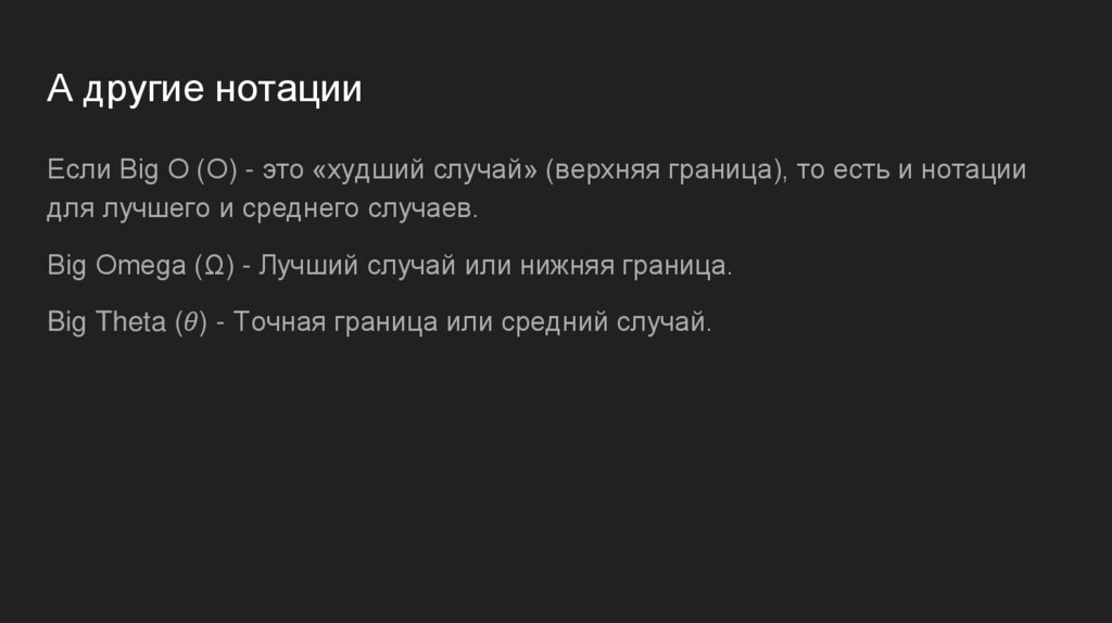 А другие нотацииЕсли Big O (O) - это «худший случай» (верхняя граница), то есть и нотации