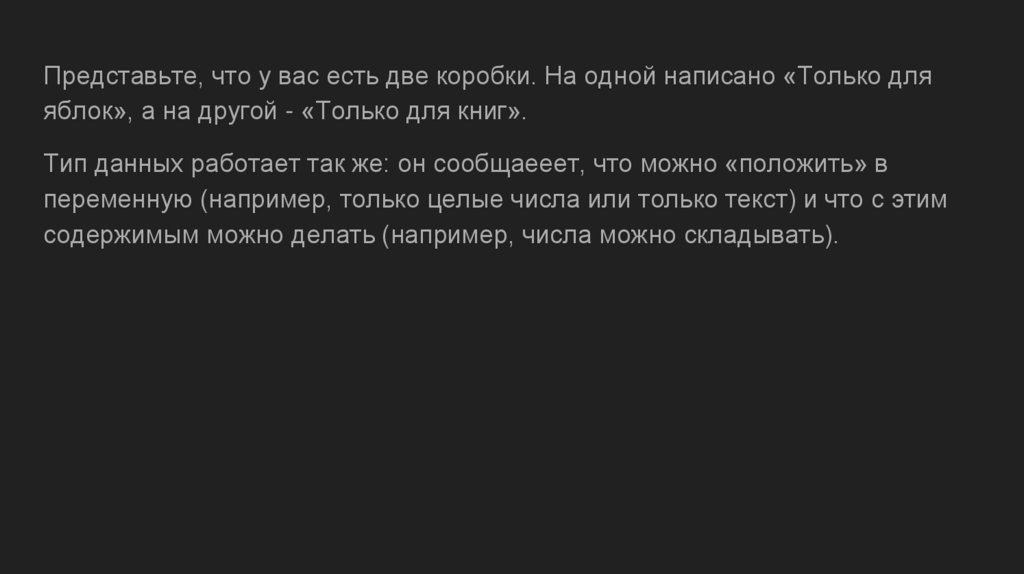 Тип данных работает так же: он сообщаееет, что можно «положить» в