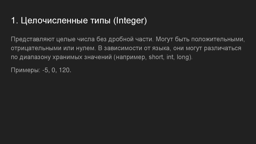 1. Целочисленные типы (Integer)Представляют целые числа без дробной части. Могут быть положительными,
