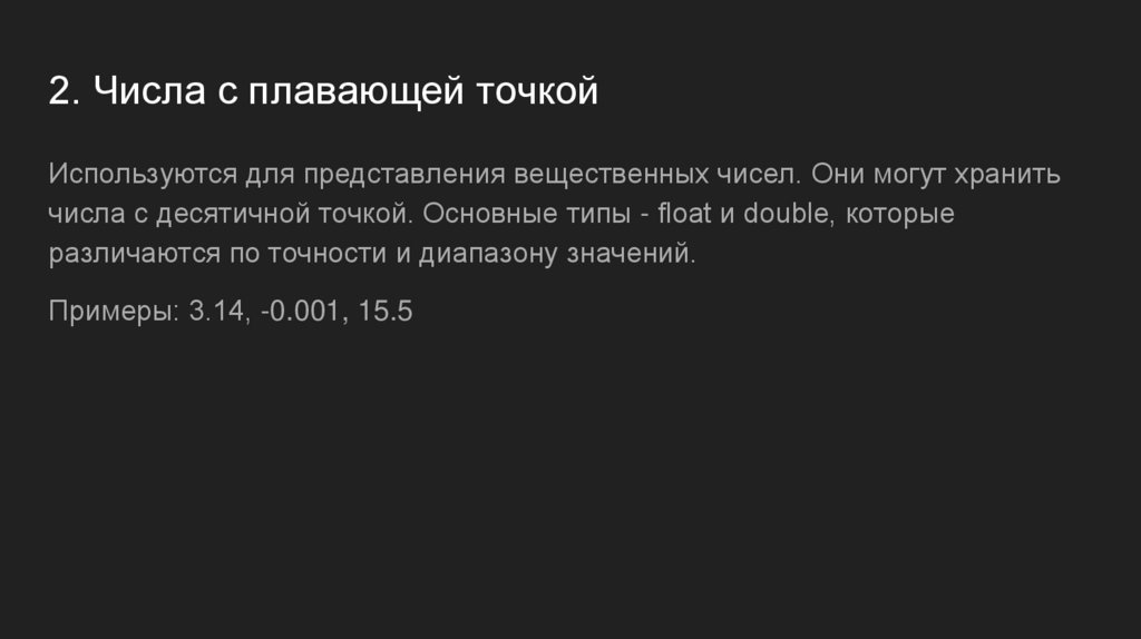 2. Числа с плавающей точкойИспользуются для представления вещественных чисел. Они могут хранить