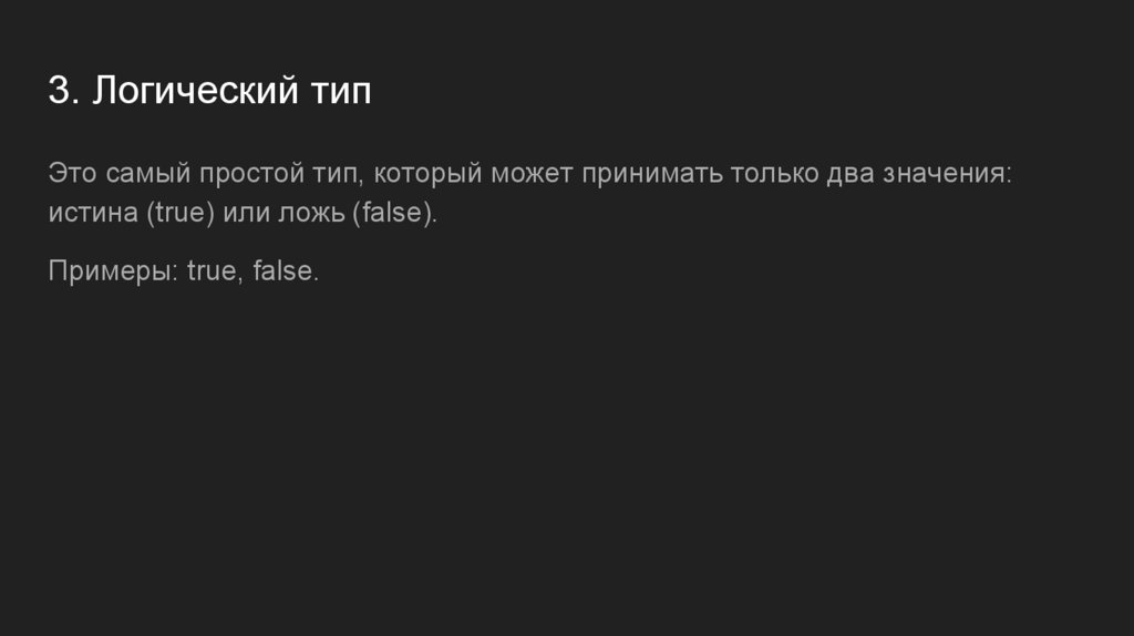 3. Логический типЭто самый простой тип, который может принимать только два значения: