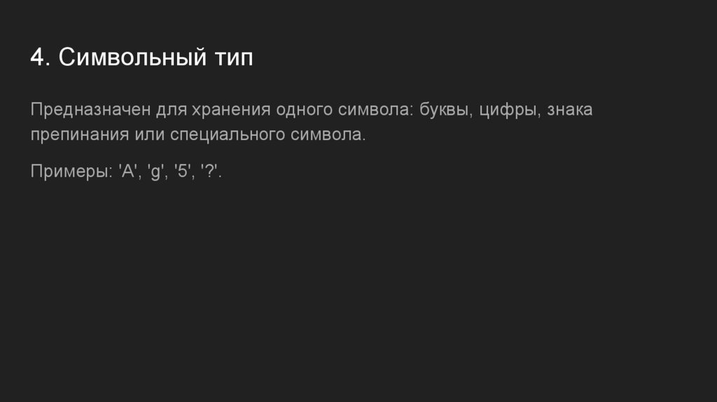 4. Символьный типПредназначен для хранения одного символа: буквы, цифры, знака