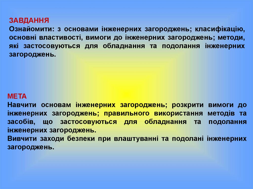 ЗАВДАННЯОзнайомити: з основами інженерних загороджень; класифікацію,
