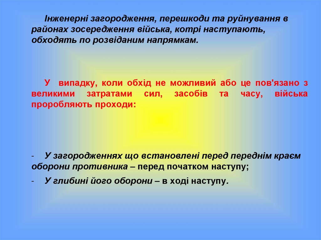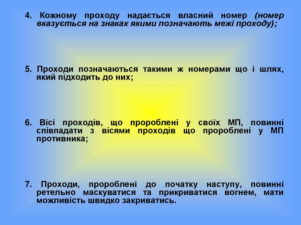 – робити та позначати проходи для виходу із замінованої ділянки місцевості;