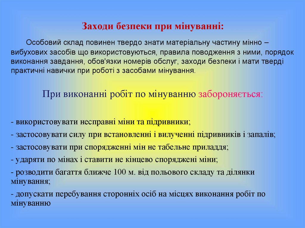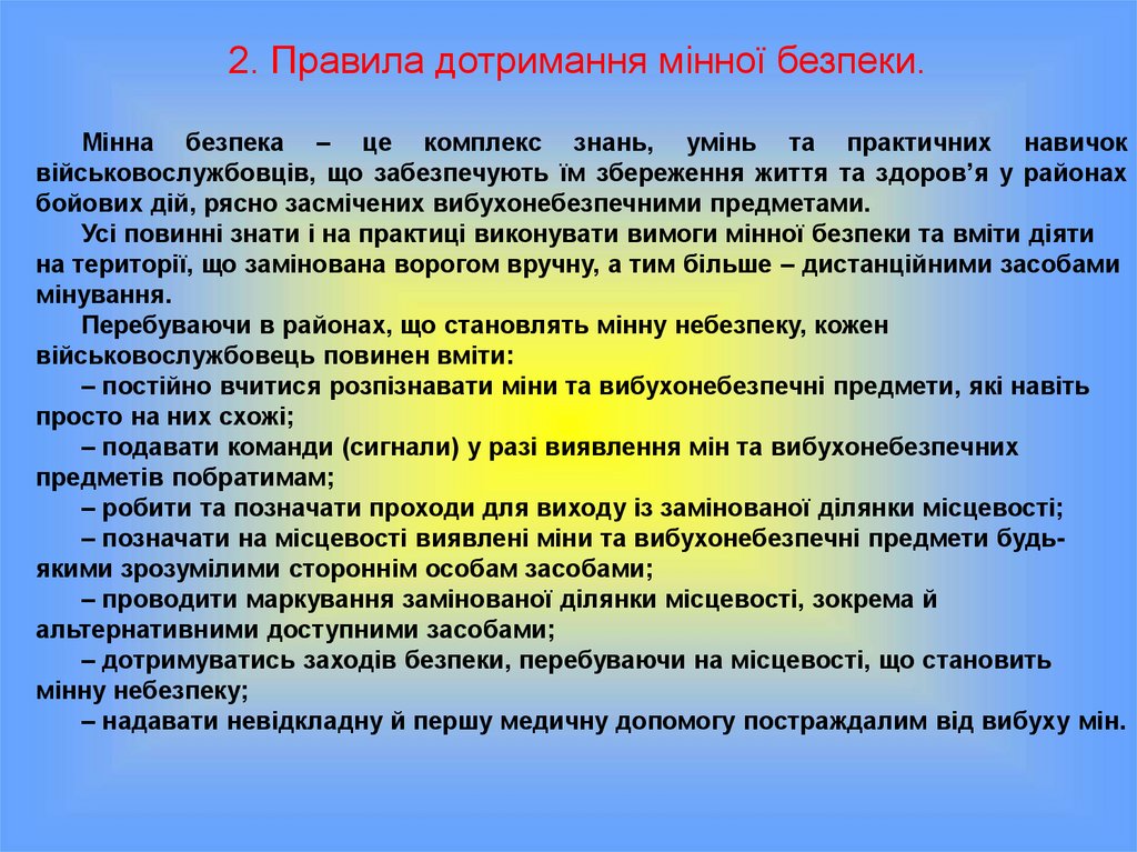 2. Правила дотримання мінної безпеки.Мінна безпека – це комплекс знань, умінь та практичних навичок