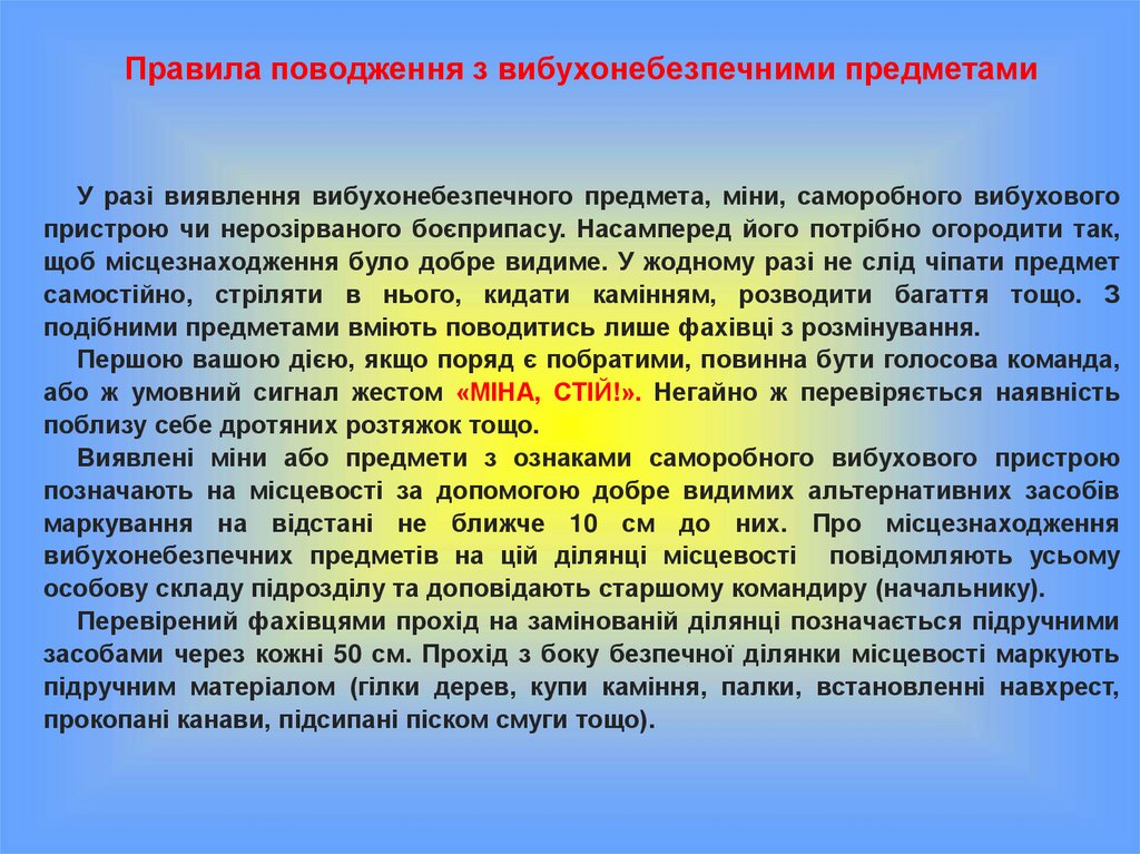– приносити без дозволу командування в розташування підрозділів будьякі вибухонебезпечні предмети.