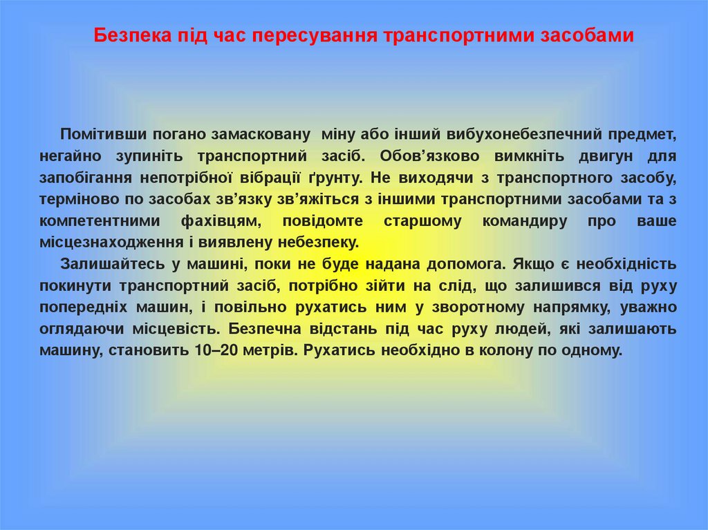 Безпека під час пересування транспортними засобамиПомітивши погано замасковану міну або інший вибухонебезпечний предмет,