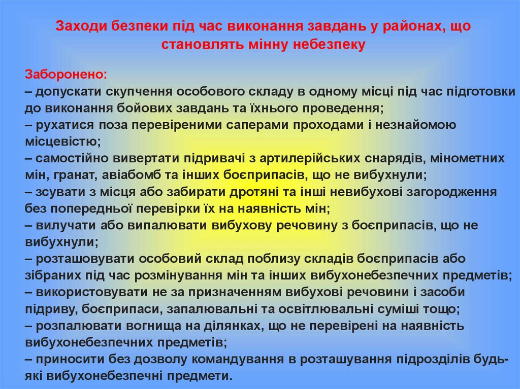 Заходи безпеки під час виконання завдань у районах, щостановлять мінну небезпеку