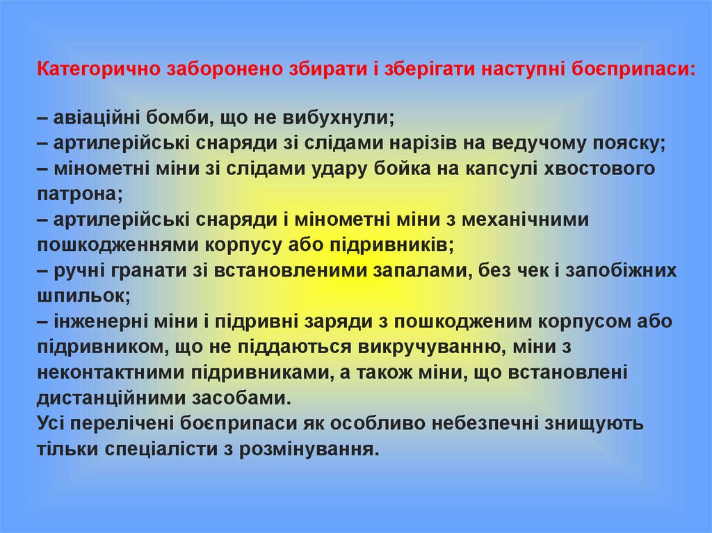Категорично заборонено збирати і зберігати наступні боєприпаси:– авіаційні бомби, що не вибухнули;