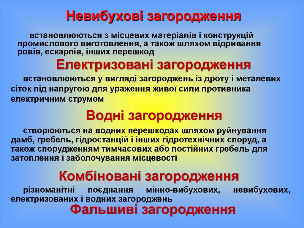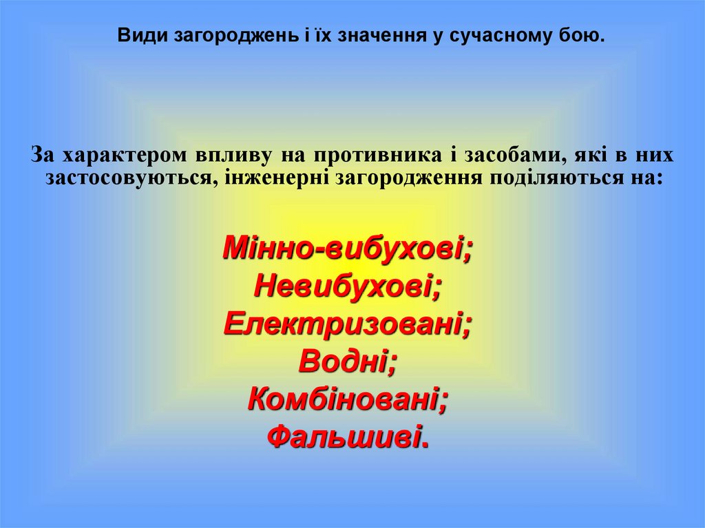 Види загороджень і їх значення у сучасному бою.За характером впливу на противника і засобами, які в них