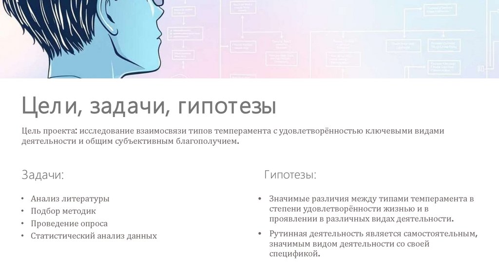 Цел и, задачи, гипотезыЦель проекта: исследование взаимосвязи типов темперамента с удовлетворённостью ключевыми видами
