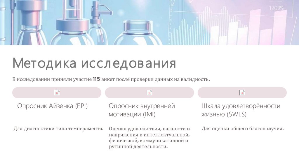 Методика иссл едов анияВ исследовании приняли участие 115 анкет после проверки данных на валидность.
