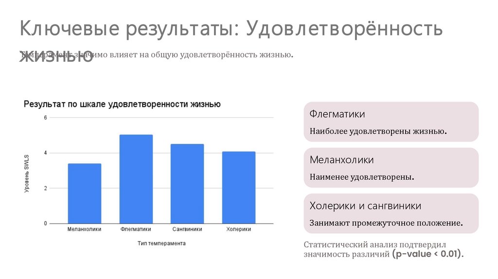 Ключевые результаты: Удов л етв орённостьТемперамент значимо влияет на общую удовлетворённость жизнью.