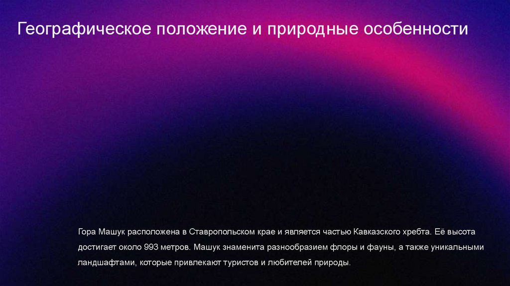 Географическое положение и природные особенностиГора Машук расположена в Ставропольском крае и является частью Кавказского хребта. Её высота