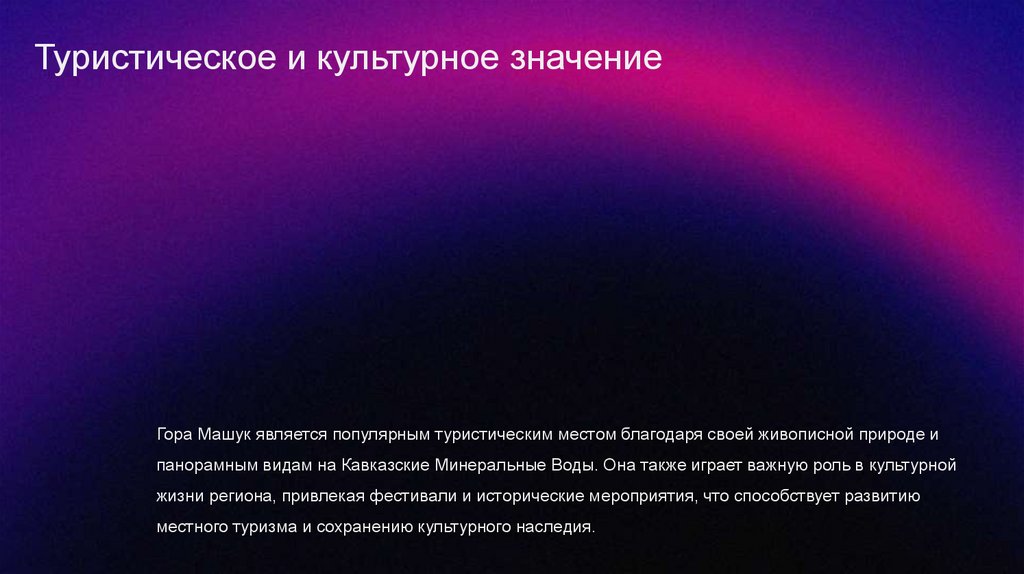 Туристическое и культурное значениеГора Машук является популярным туристическим местом благодаря своей живописной природе и