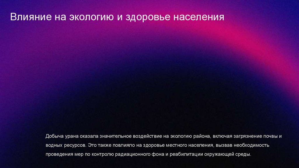 Влияние на экологию и здоровье населенияДобыча урана оказала значительное воздействие на экологию района, включая загрязнение почвы и