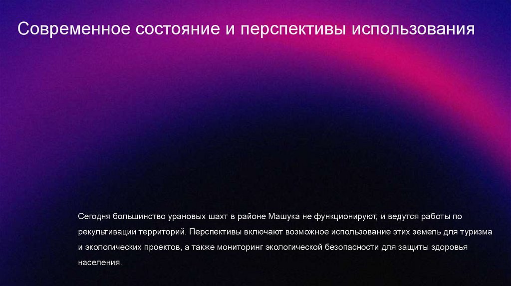 Современное состояние и перспективы использованияСегодня большинство урановых шахт в районе Машука не функционируют, и ведутся работы по