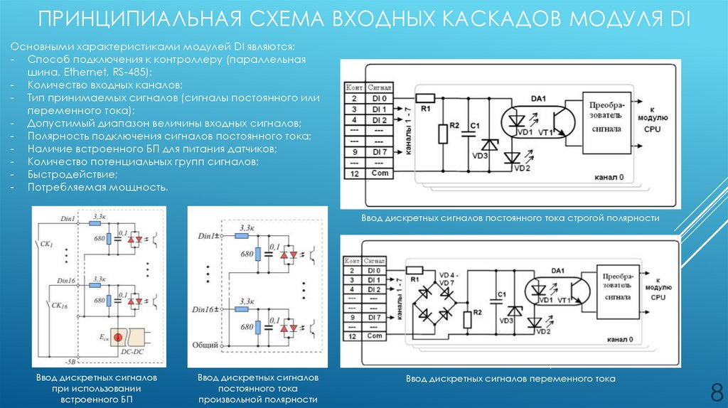 ПРИНЦИПИАЛЬНАЯ СХЕМА ВХОДНЫХ КАСКАДОВ МОДУЛЯ DIОсновными характеристиками модулей DI являются: