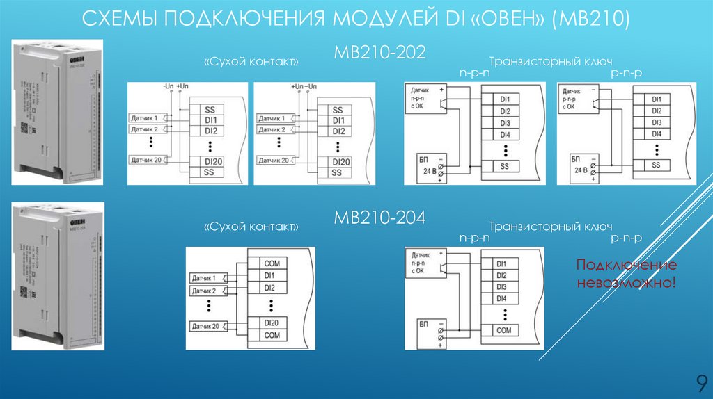 СХЕМЫ ПОДКЛЮЧЕНИЯ МОДУЛЕЙ DI «ОВЕН» (МВ210)«Сухой контакт»