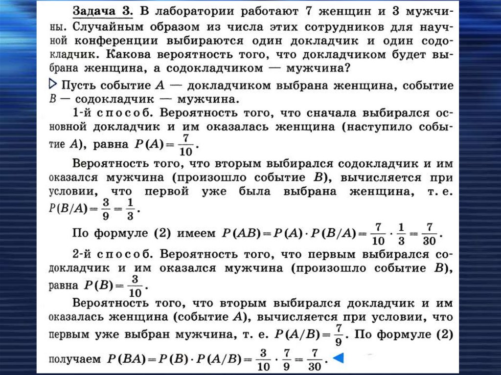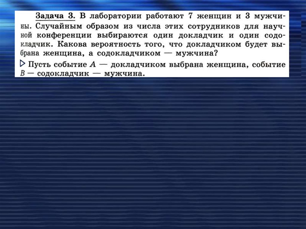 PA ( B) P( B / A) P( AB) / P( A)Пример. В коробке 3 белых и 7 чёрных шаров. Из неё дважды вынимают по