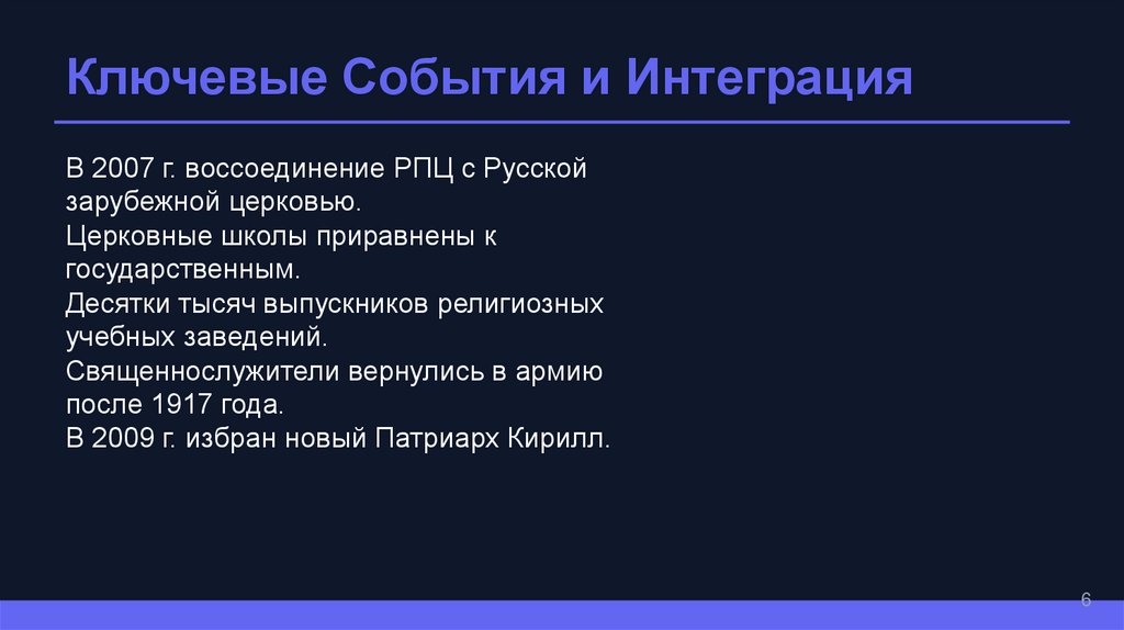 Ключевые События и ИнтеграцияВ 2007 г. воссоединение РПЦ с Русской