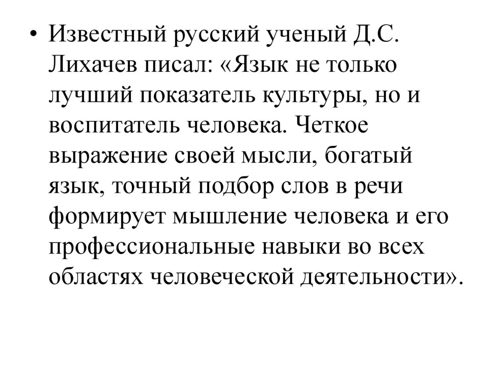 • Известный русский ученый Д.С.Лихачев писал: «Язык не только