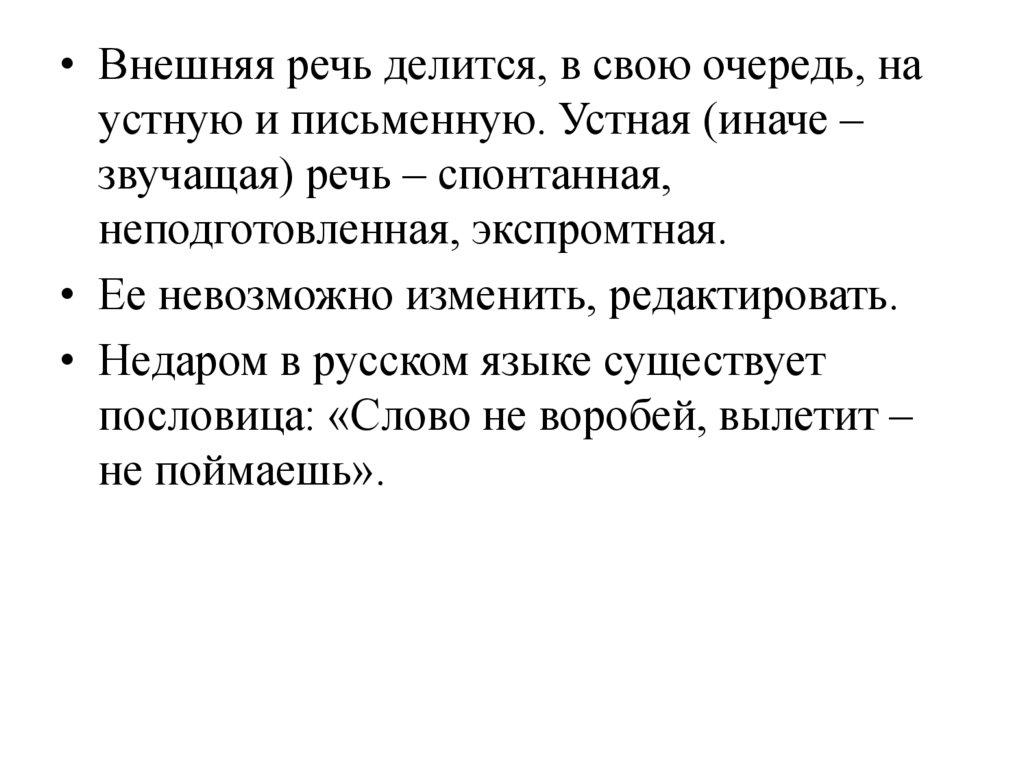 • Внешняя речь делится, в свою очередь, наустную и письменную. Устная (иначе –