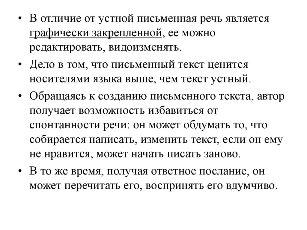• В отличие от устной письменная речь являетсяграфически закрепленной, ее можно