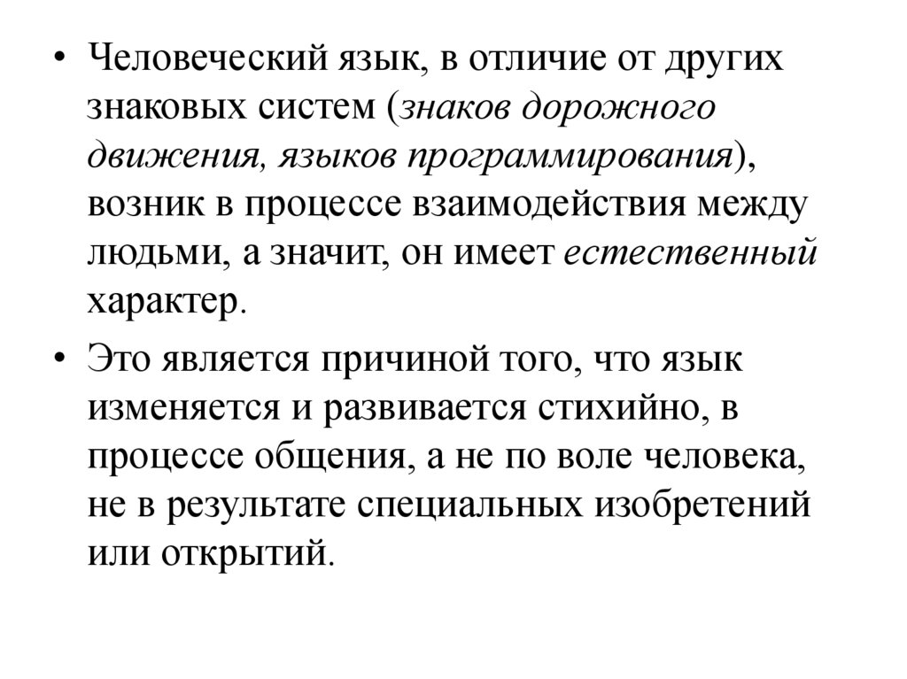 • Человеческий язык, в отличие от другихзнаковых систем (знаков дорожного