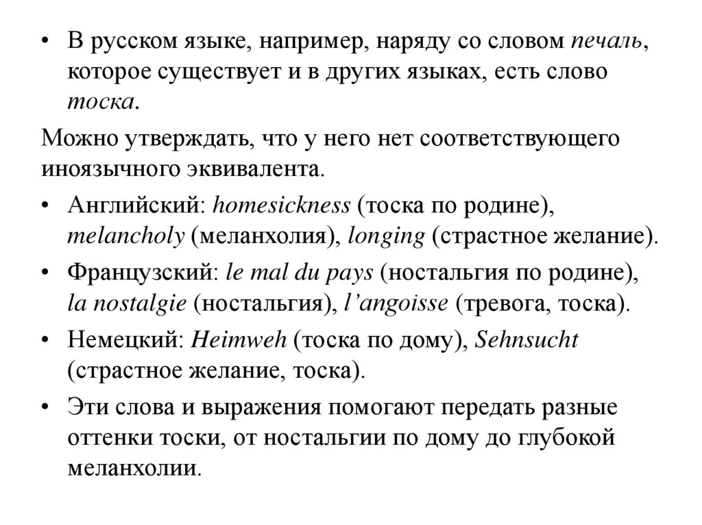 • В русском языке, например, наряду со словом печаль,которое существует и в других языках, есть слово