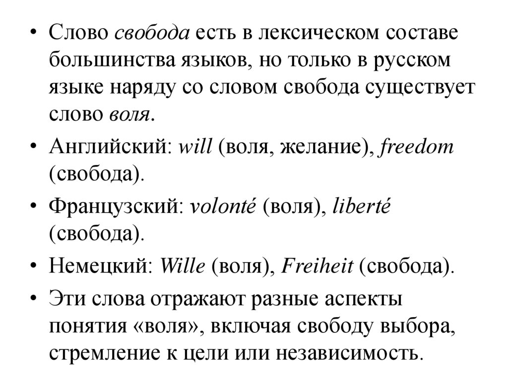 • Слово свобода есть в лексическом составебольшинства языков, но только в русском
