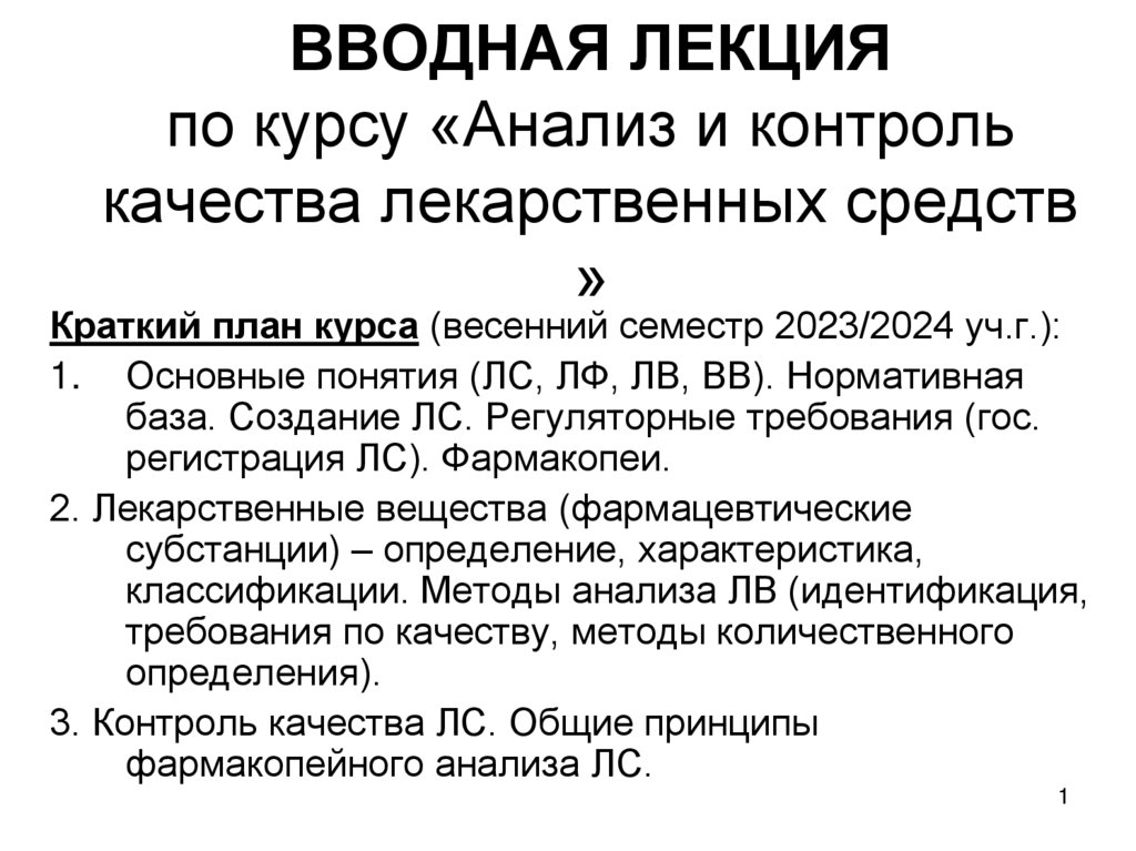 1. ВВОДНАЯ ЛЕКЦИЯ по курсу «Анализ и контроль качества лекарственных средств »