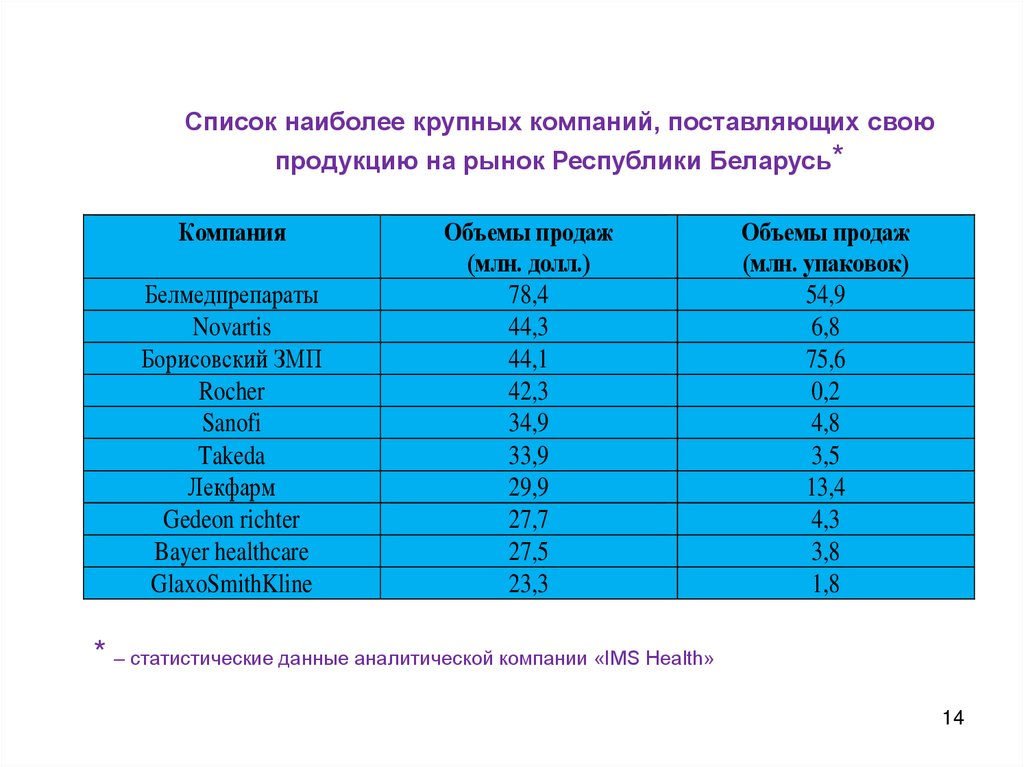 Список наиболее крупных компаний, поставляющих своюпродукцию на рынок Республики Беларусь*
